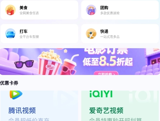 首页会推送来自不同平台的优惠券,涵盖视频会员与外卖会员等多种类型,福利优惠十分丰富。