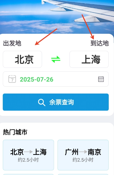 大家只需输入始发地和目的地,就能查询机票信息了。