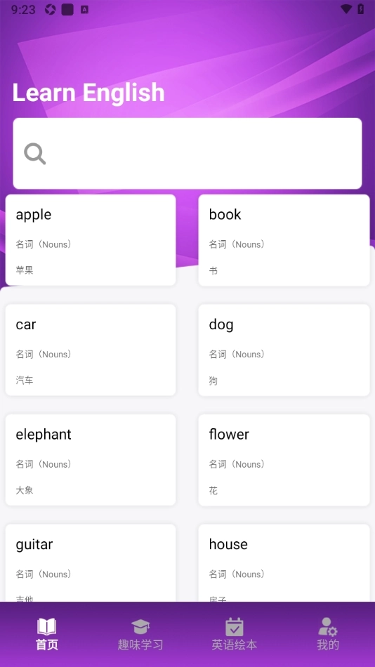 1、进入首页便是背诵英语单词的界面,各类单词都会在此呈现,还配有对应的中文说明,另外界面最上方的搜索框能帮助用户快速查询不懂单词的含义。