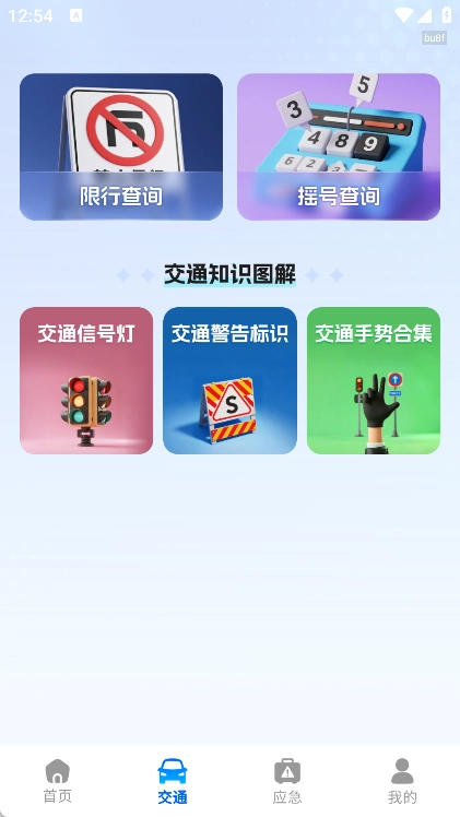 2、在交通页面中,用户能够进行限行查询、摇号查询等操作,获取相关信息,还可以了解交通知识图解内容。