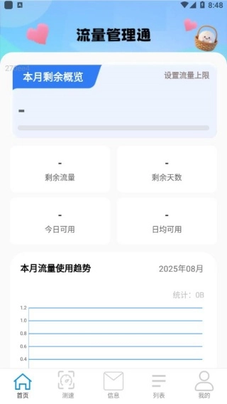 完成安装后直接点击进入,平台首页会清晰展示本月剩余流量概览、流量使用趋势以及应用流量排行等详细数据。