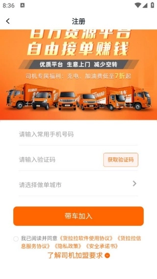 2、找到货拉拉司机注册入口并点击,进入注册页面后,依次填写手机号码、验证码和接单城市,最后勾选同意相关条款,即可完成注册流程。