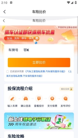 3、进入车险报价板块,输入车牌号后点击立即比价,就能轻松对比不同方案,方便你做出更合适的选择。