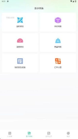 2、数学转换页面提供了面积转换、体积转换、速度转换、重量转换、随机数生成器、汇率计算等功能。