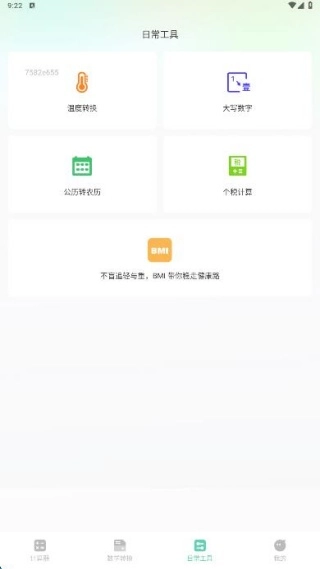 3、日常工具页面,为我们带来了温度转换、大写数字、公历转农历、个税计算、bmi计算等功能。
