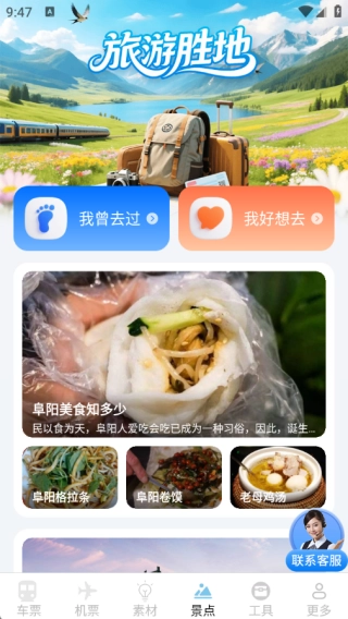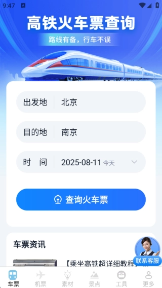实时查火车机票是一款能随时快速查询火车票与机票信息的软件。通过它,你可以获取各类查询服务,了解乘车相关的实用信息;还能查看各地的天气情况,知晓不同景点的详细介绍,以及全面了解各地的特色美食。