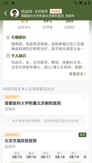 2、进入该专家的预约挂号界面后,页面会清晰展示其专业擅长领域、个人简历介绍,以及可预约挂号的具体日期;点击相应日期即可完成预约操作。