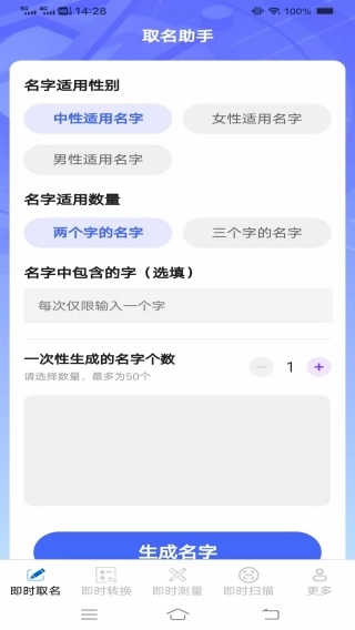 2、即时取名操作简单容易,根据自己的需求去开启取名的操作,还可以获取一次性生成名字的个数。