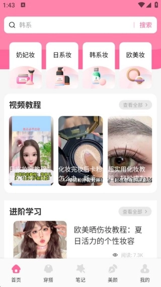1、安装软件后进入,首页提供了丰富的化妆教程,还可以通过观看视频进行学习。