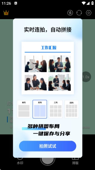 4、点击边拍边拼可以选择拼图模式,然后进行拍照体验,主要用于工作汇报。