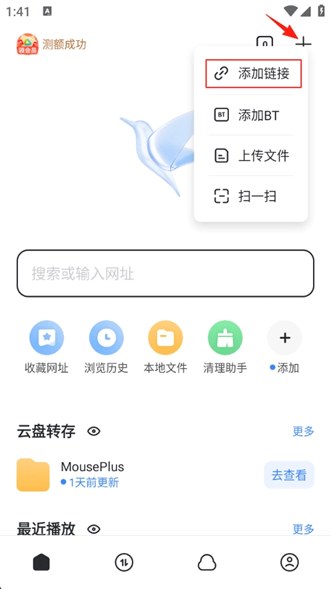 1、启动迅雷应用进入首页后,点击界面右上角的加号按钮,选择添加链接选项。
