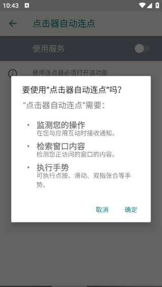 3、记住一定要给点击器自动连点执行首饰的权限,跳转到下面这个画面,然后点确定就开通权限,回到软件之后就能使用;