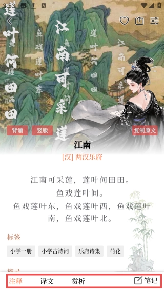 4、点击心仪的诗词,即可聆听朗诵音频,同时还能查看相关注释、记录阅读笔记等。