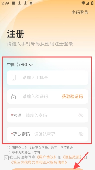安装完成后,跳过海报页面,阅读并同意“隐私政策与用户协议”。
