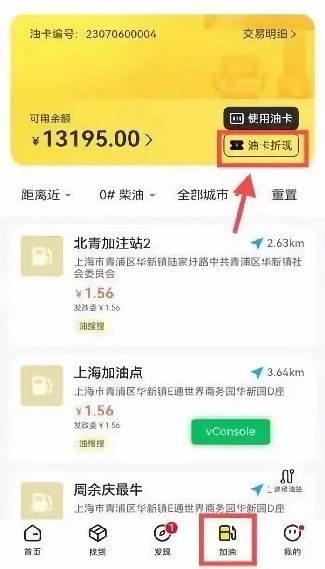 打开软件后,先点击【加油】选项,随后点击【油卡折现】功能。