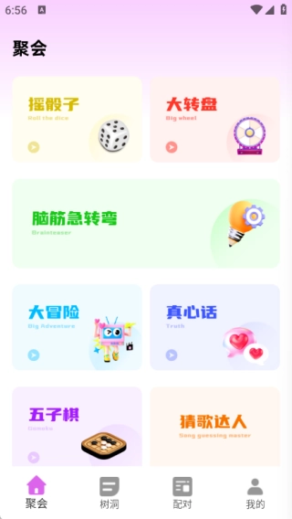 1、聚会页面里设置了摇骰子、大转盘、脑筋急转弯、大冒险、真心话、五子棋、猜歌达人等多种互动玩法;