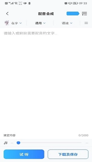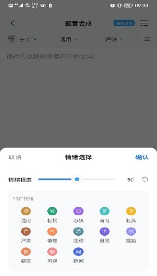3.把需要配音的文字输入进去,在页面上方能够对配音所采用的声音、情绪以及语速进行选择。