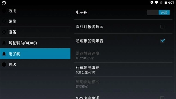 5、电子狗界面情况:支持对闯红灯提醒功能进行设置。