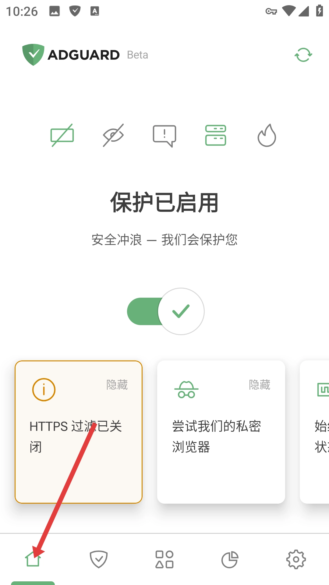 1、首页展示保护已开启状态,可查看HTTPS过滤等相关信息,点击底部房子图标返回主页,能够快速浏览防护概况,通过界面功能按钮,可随时掌握安全防护状态。