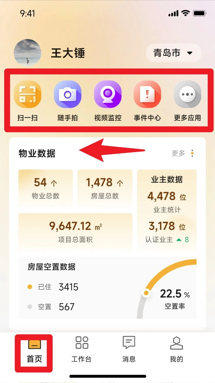1、首页数据聚合:核心物业指标集中呈现,关键信息清晰直观。