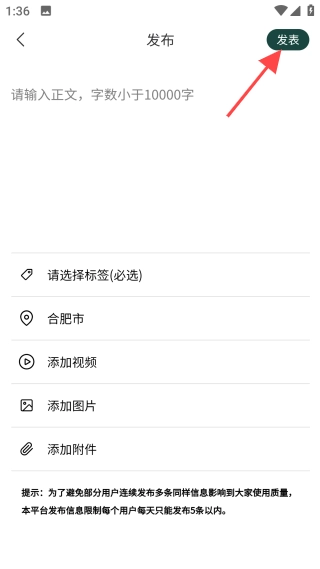 4、根据提示输入相关内容,选择对应的标签、地址等信息后,点击【发表】按钮就能完成操作。