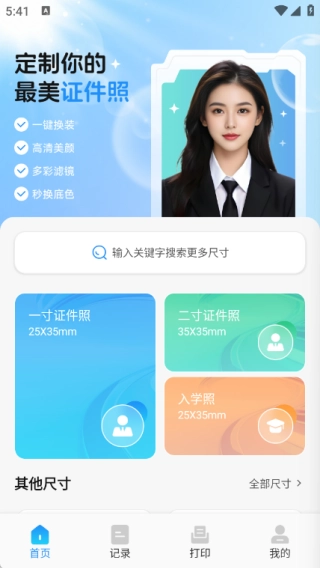 1、在首页中输入关键字即可快速搜索各类尺寸,同时还有一寸证件照、二寸证件照和入学照,还有其他尺寸版块;