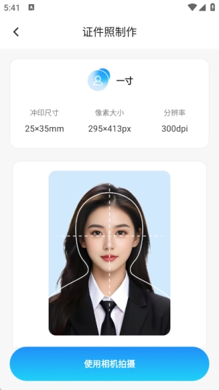 2、点击一寸证件照,然后了解一寸具体的规格,点击使用相机拍摄进行拍摄制作;