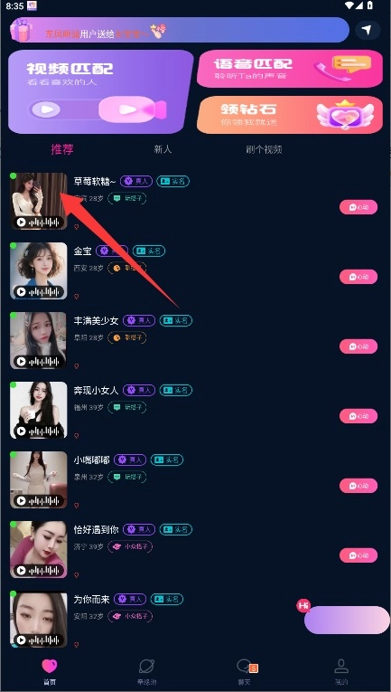 3、进入应用首页后,能浏览系统推荐的用户列表,挑选心仪的用户并点击其头像,即可进入查看该用户的相关信息。