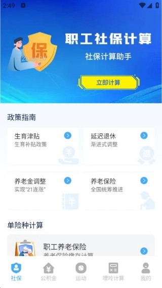 2、进入社保板块后,能便捷地开展计算操作,还可查看政策指南等相关内容。