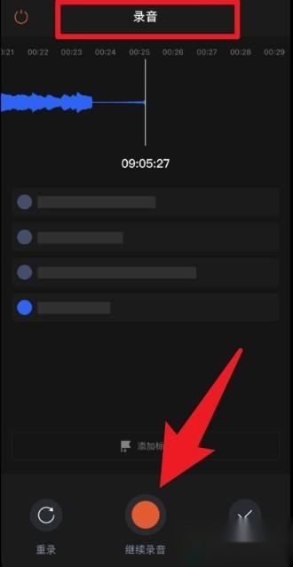 1、在录音界面,用户可以点击“继续录音”按钮延长录制时间,也可以选择“重录”或“完成”操作,使录音保存与编辑更加灵活和高效。