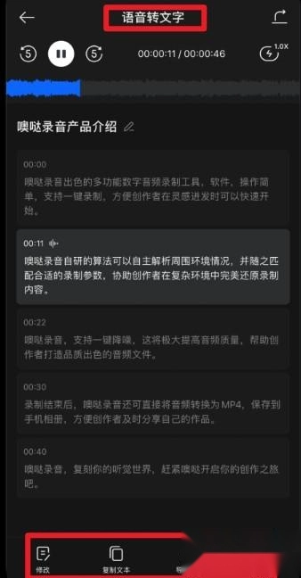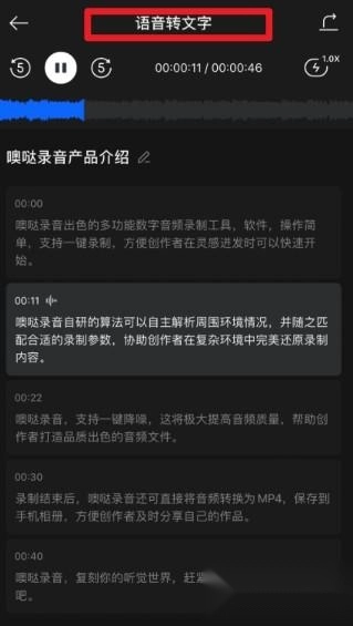 2、录音完成后可选择“语音转文字”功能,系统会自动将录音内容逐句转写为文字,并显示时间轴,方便用户进行内容的整理与修改。