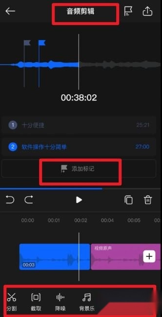 4、在音频剪辑界面中,用户可以对录音内容进行“分割、截取、降噪、背景乐、音调、变速”等多种处理,同时支持“添加标记”,让音频编辑更灵活。