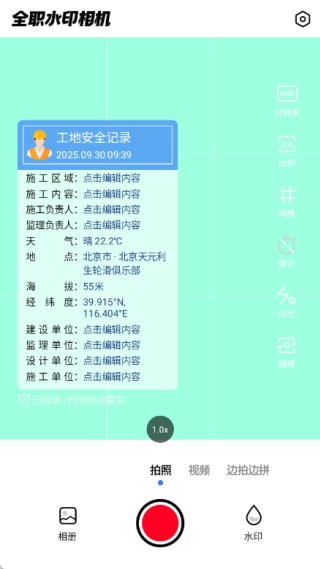 全职水印相机是一款专为工作记录设计的防篡改工具,全职水印相机App能一键为照片添加不可修改的时间、地点、坐标等关键信息,确保照片真实可靠,它还提供多种取证模板和精准的智能定位功能,适配工程监督、外勤打卡、巡检记录等多种工作场景。