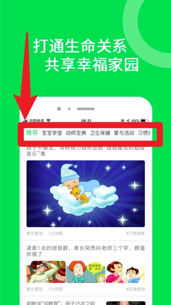 4. 在推荐区块中选择内容分类,如宝宝学堂、爱与活动等,获取丰富的育儿资源。