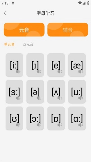 2、点击“字母学习”板块,可选择元音或辅音进行专项学习,让学习过程更便捷高效。