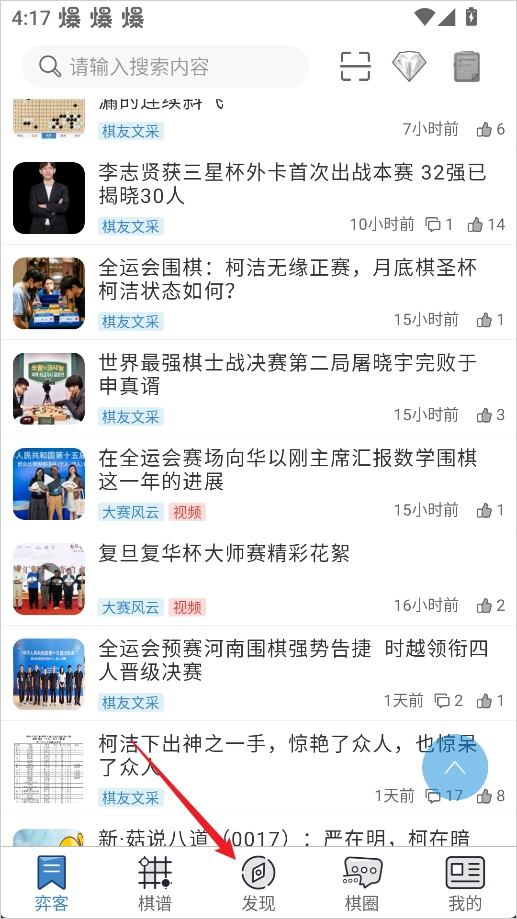 1、打开弈客围棋后,在底部导航栏点击【发现】。
