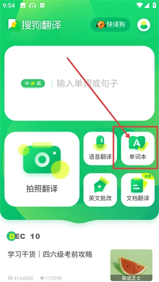 1、在搜狗翻译首页点击【单词本】选项,就能进入单词学习管理页面,开启词汇积累的旅程啦。