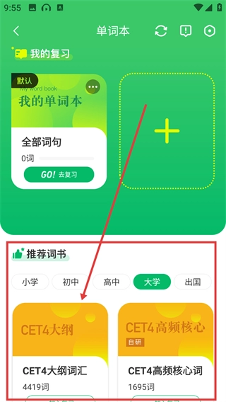 进入单词本后,在推荐词书里挑选与自己学段对应的词书,例如大学阶段的话,选择【CET4大纲词汇】这类词书就比较适合备考使用。