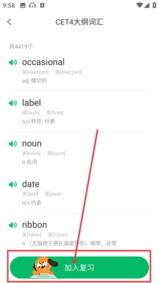 3、进入目标词书页面后,点击底部【加入复习】按钮,就能把这些词汇添加到你的复习列表中啦。