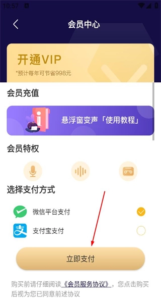 4、登录后进入会员中心页面,选择微信平台支付方式,点击立即支付按钮,完成会员开通的支付流程。