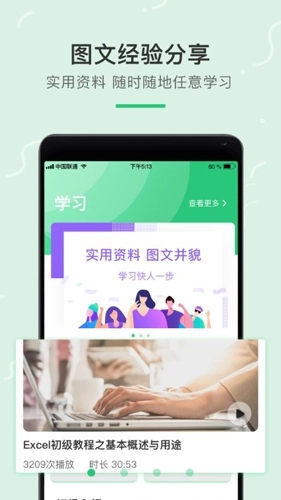 2、进入软件首页后,能看到首页、学习、模板、我的这四个不同模块,其中首页和学习模块包含了丰富的excel知识可供学习。