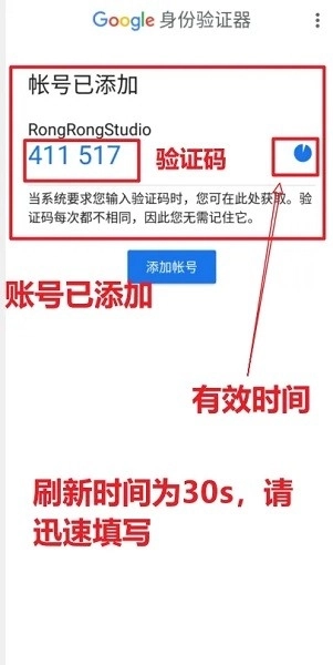 随后便会弹出“账号已添加”的提示,同时生成一组六位数的验证码;