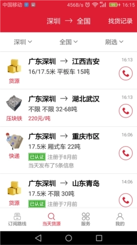 寻找专线货源,每个司机可以根据自己的路线而在这里找到与自身路线匹配的货源;