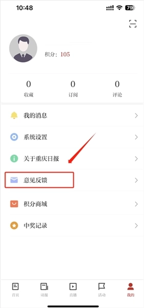 1、在“我的”页面选择“意见反馈”选项。