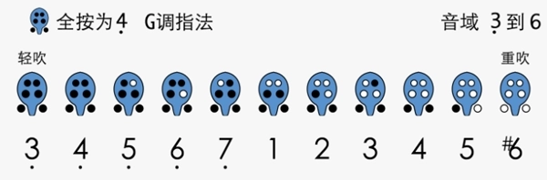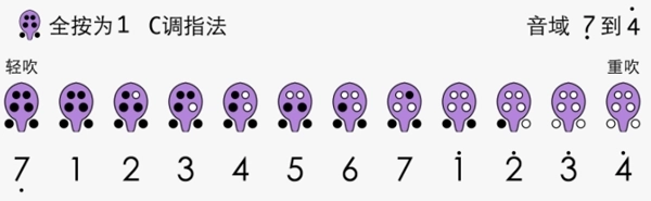 最后介绍一种全按(不包括食指负责的两个小孔)对应低音4的指法,用它能够吹出从低音2到中音6的音阶。不过由于这种指法的音域覆盖范围比较有限,所以实际应用中很少会用到它。