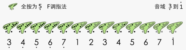 下面的指法以全按(食指负责的两个小孔除外)作为低音5的基准,能够吹奏出从低音3到高音1的音阶,足以覆盖多数常见乐曲的需求。