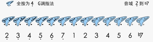 最后再介绍一种全按作低音4的指法,它能够吹奏出低音4至中音6的音阶。要是配合一些技巧,还能吹出低音3。不过这种指法由于覆盖的音域比较有限,所以平时很少被使用。用C调陶笛采用这种指法演奏出来的调是G调。