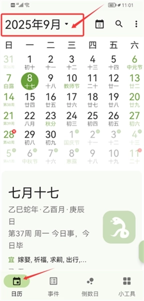 1、启动应用后,在日历页面可查看当月公历与农历日期及宜忌信息。