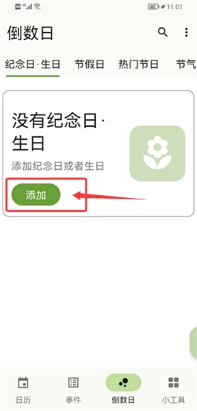 2、切换至倒数日功能,可通过添加按钮设置纪念日或生日提醒。