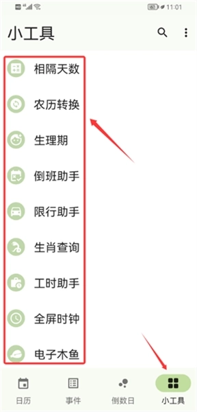3、进入小工具页面,可使用相隔天数、农历转换等多项辅助功能。